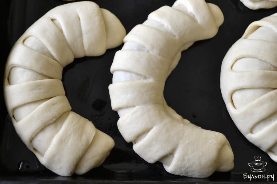4. Смажьте растительным маслом противень и положите на него рулетики, немного изогнув их, придав форму полукруга-рогалика.