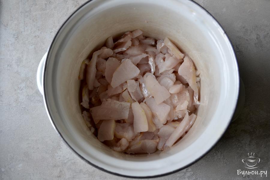 3. Нарезанное мясо переложите в кастрюлю или глубокую миску, которую в последствии можно будет закрыть.