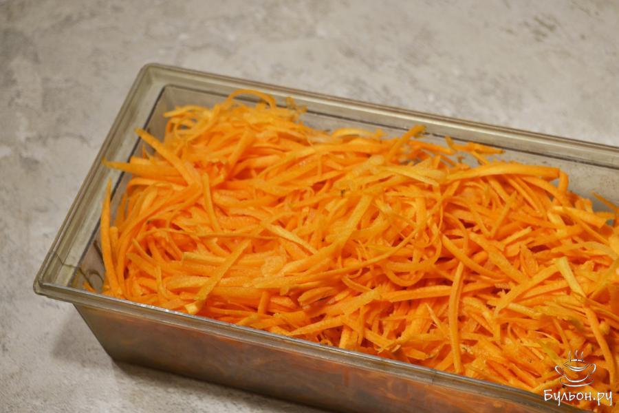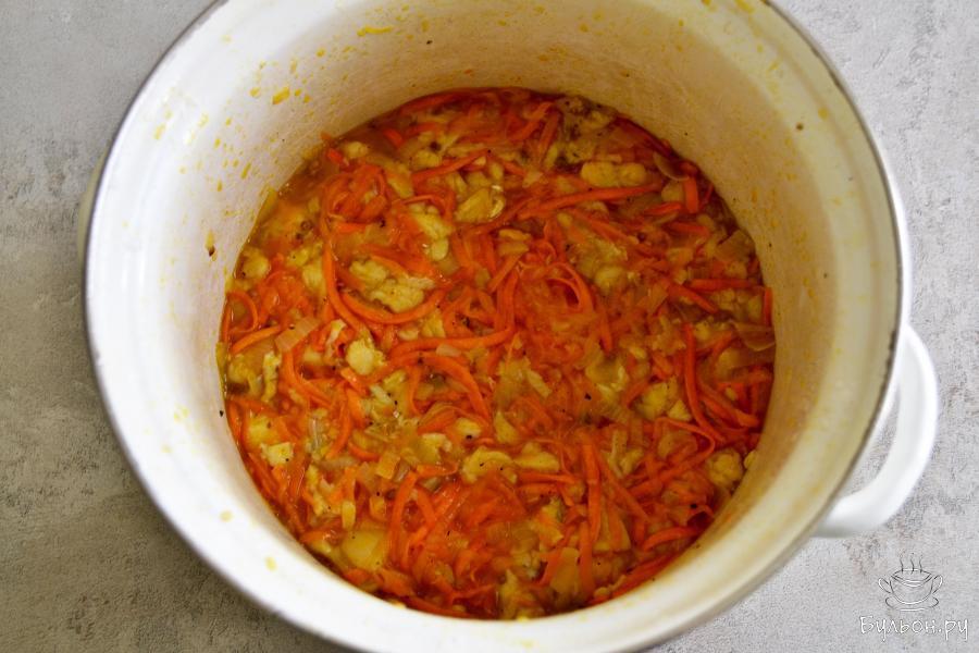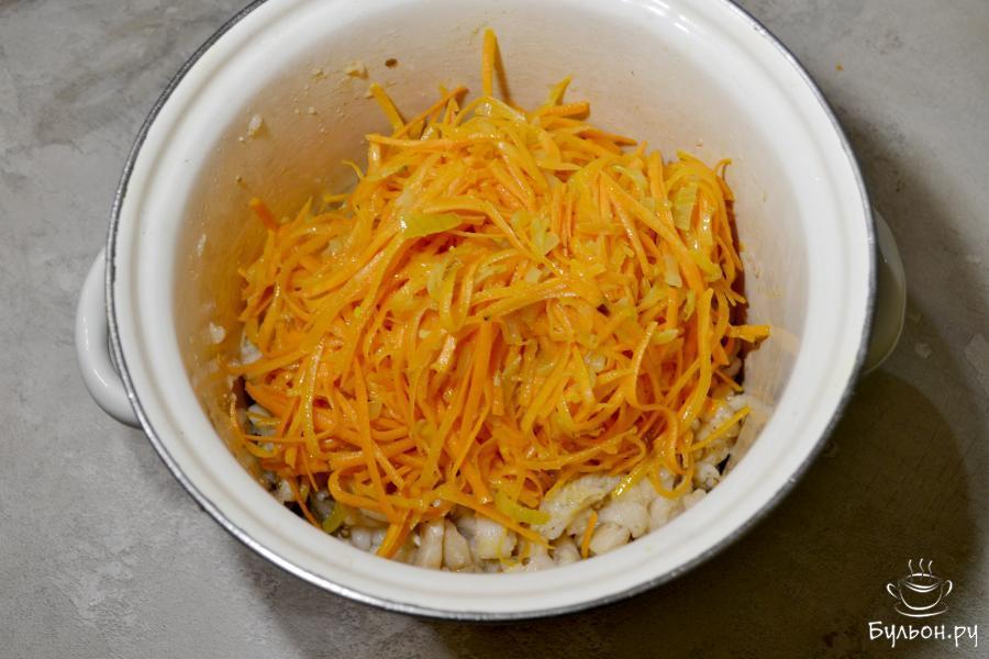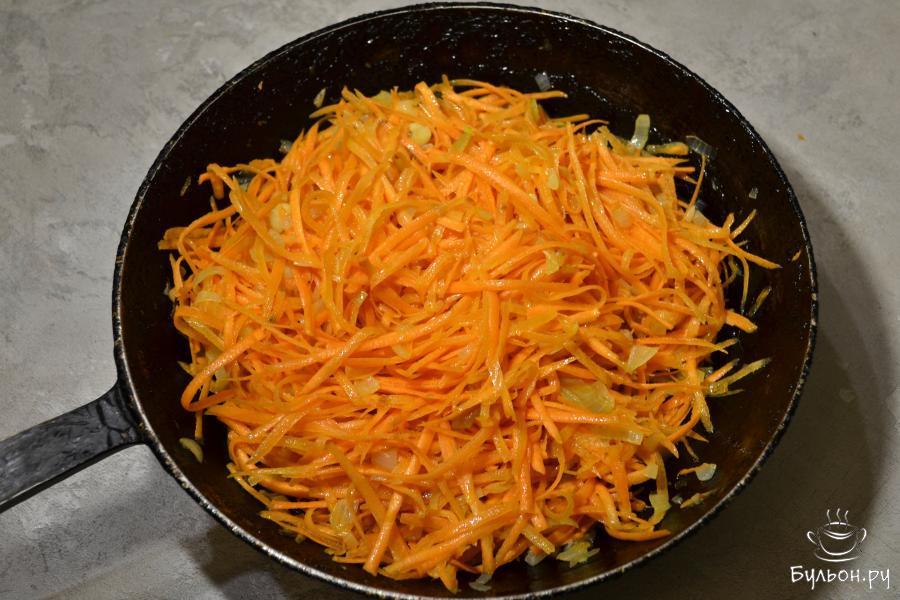 9. Положите в сковороду морковь. Перемешайте с луком и сразу же снимите с огня. Оставьте овощи на несколько минут, чтобы морковь стала мягкой.