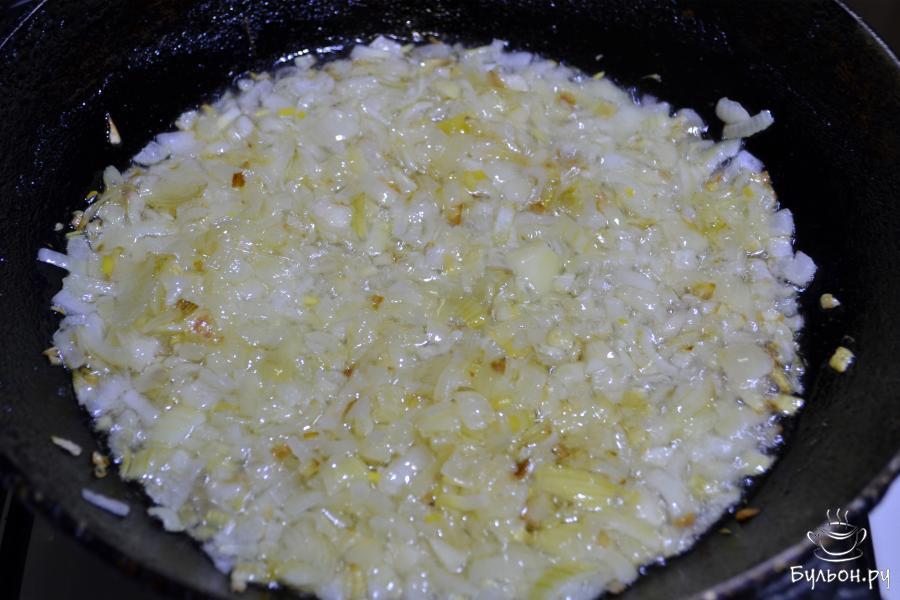 8. В глубокой сковороде хорошо разогрейте растительное масло и выложите подготовленный лук. Обжаривайте лук, до прозрачности, несколько минут.