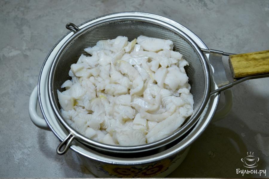 5. Спустя указанное время, попробуйте кусочек рыбы. Если очень чувствуется уксус, промойте рыбу под струей холодной воды и откиньте на дуршлаг. Если рыба нормальная, то просто переложите ее в дуршлаг, чтобы избавиться от жидкости.