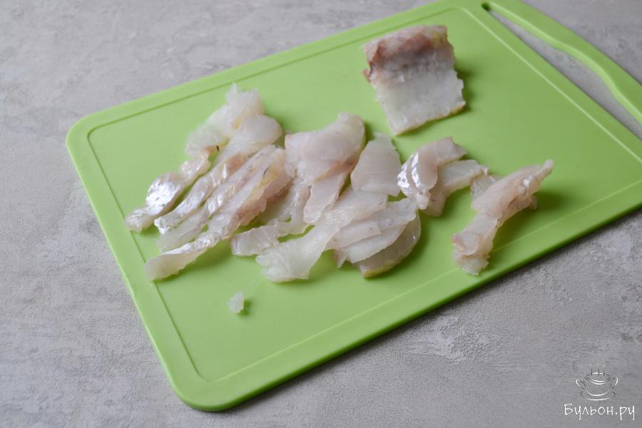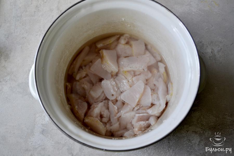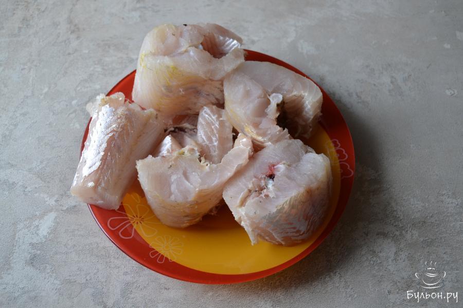 1. Рыбу тщательно вымойте и почистите от чешуи и еще раз вымойте. Распорите брюшко и удалите внутренности, отрежьте хвост, голову и снимите кожу. Разрежьте тушку судака на кусочки. В рецепте - средняя рыба, вес филе примерно 600 г.