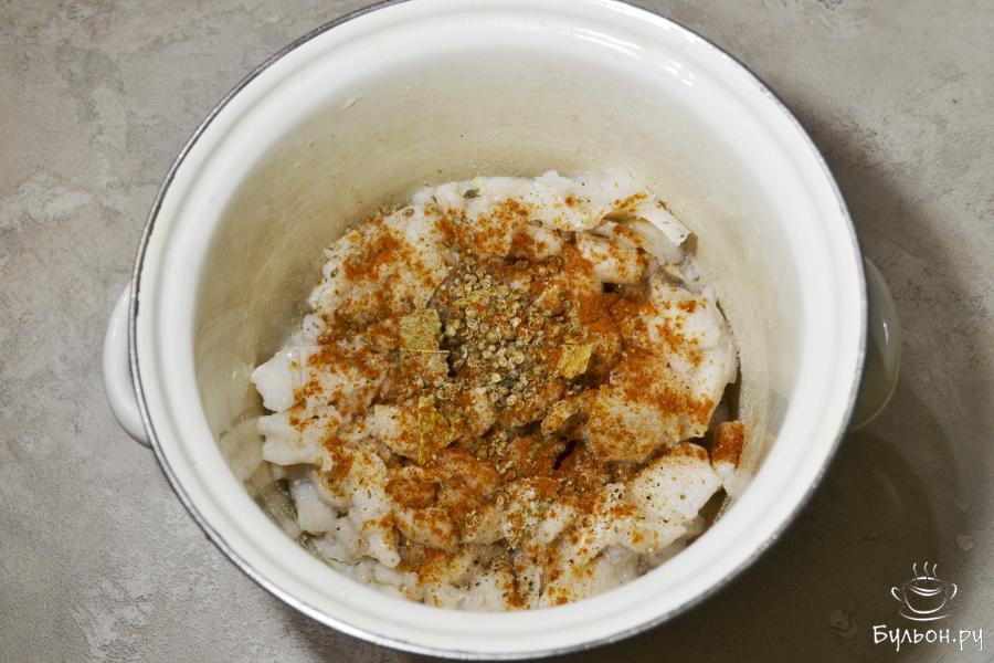 10. Когда с кусочков рыбы стечет вся жидкость, переложите ее обратно в кастрюлю и посыпьте паприкой, черным молотым перцем, раздробленными семенами кориандра, солью и лавровым листом.