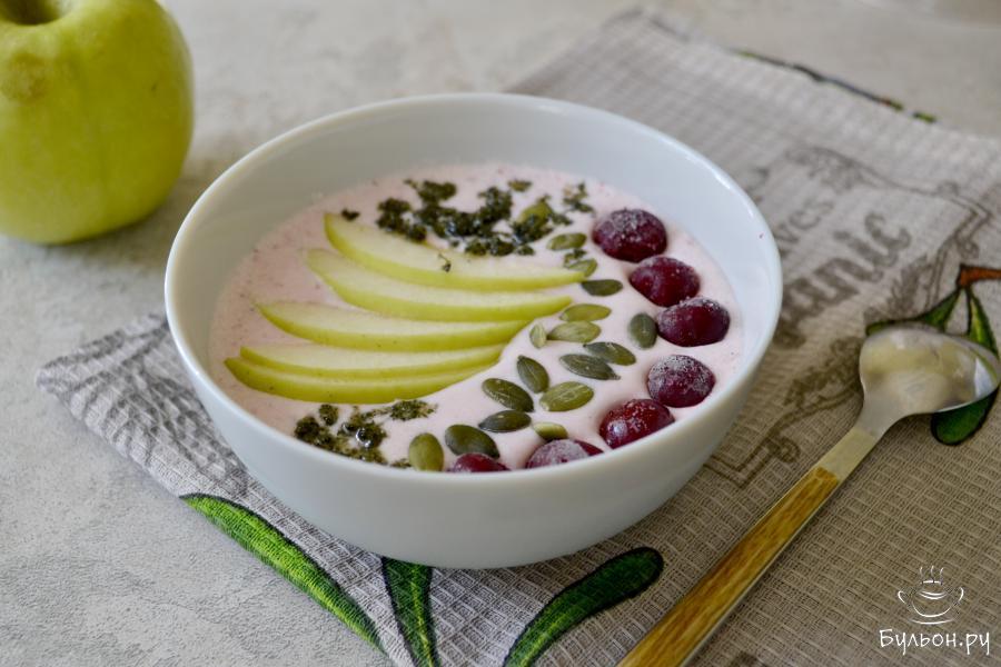 Смузи-боул - популярное блюдо среди тех, кто интересуется здоровым питанием. По сути, это тот же смузи, только более густой, чтобы на его поверхности могли удержаться украшения в виде ягод, семян, кусочков фруктов. Подают смузи-боул в глубокой тарелке и кушают ложками. За основу берутся мягкие фрукты, творог, кисломолочные напитки. А для украшения используются орешки, кусочки фруктов, ягоды, хлопья овсяные и кукурузные, семена чиа и т. д.