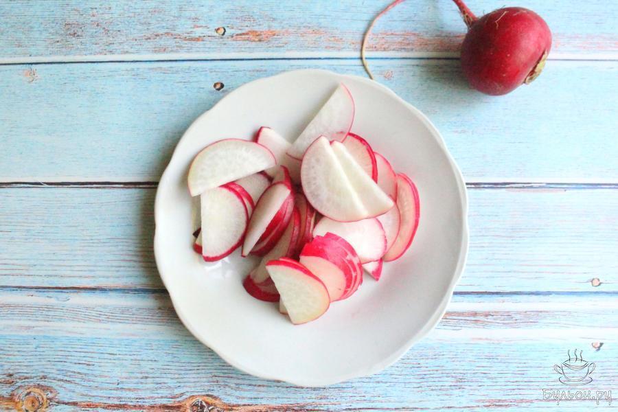 1. Редис промоем, обсушим и срежем у него хвостики. Нарежем редис тонкими кружочками или полукружочками.