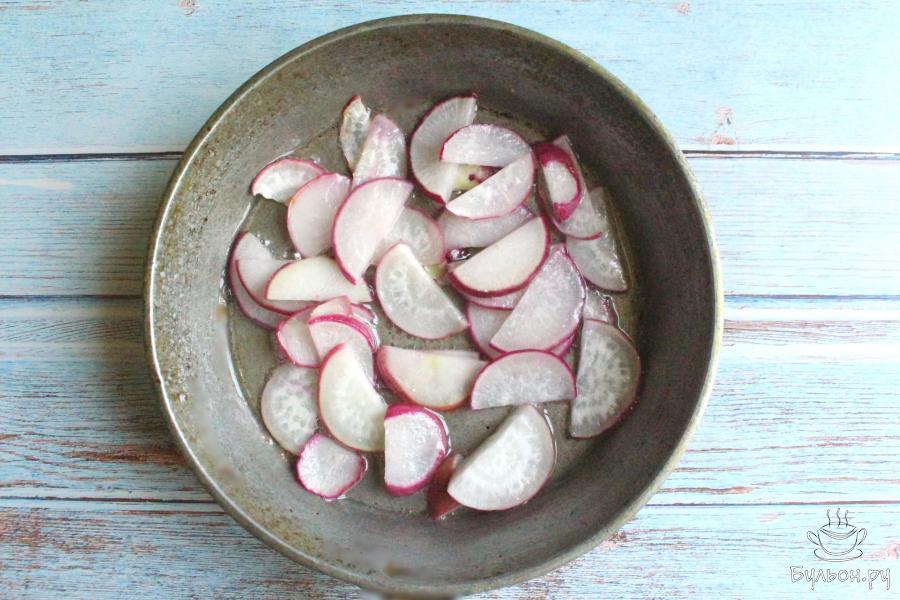 2. Обжарим редис на разогретом масле несколько минут, он очень быстро становится мягким. Помешиваем редис.
