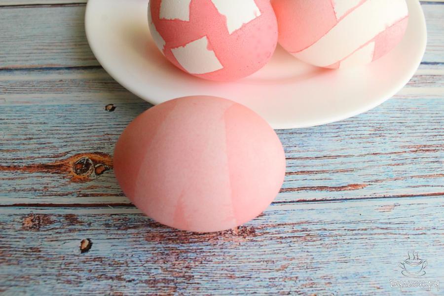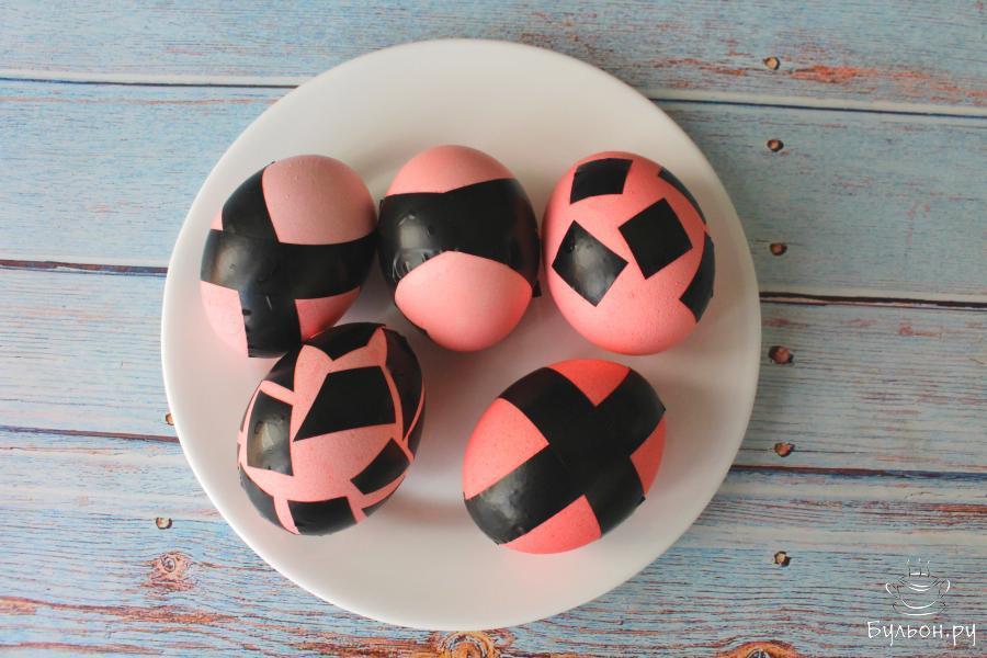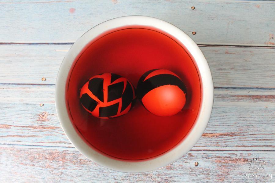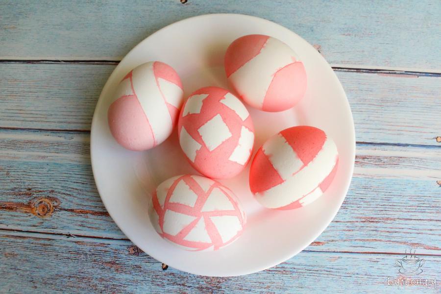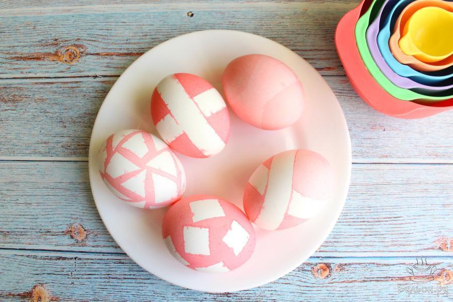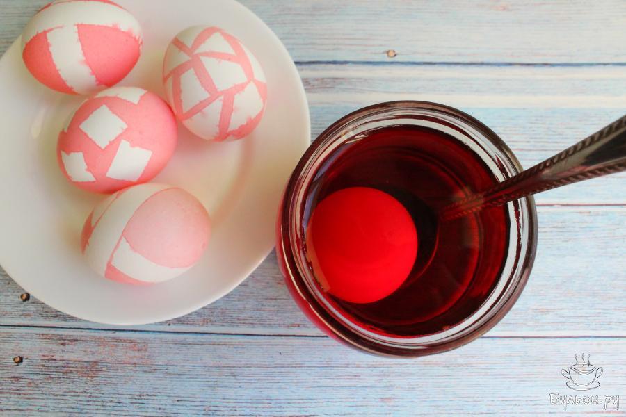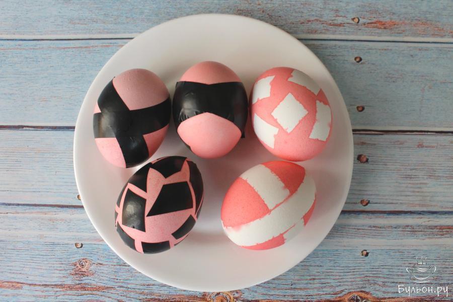 10. Тогда рисунок будет не чисто белый, а немного светлее всего яйца. Можно окунуть яйца без изоленты в краситель другого цвета и получить разные варианты оттенков и узоров.