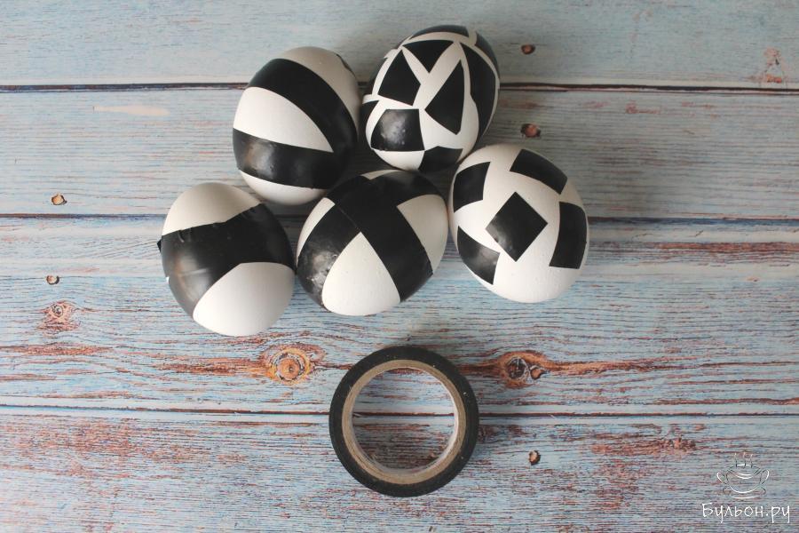 3. Когда яйца немного остынут начинаем обклеивать их изолентой. Можно вырезать и клеить кусочки в виде мозаики, можно обклеивать яйца длинными полосками изолетны.