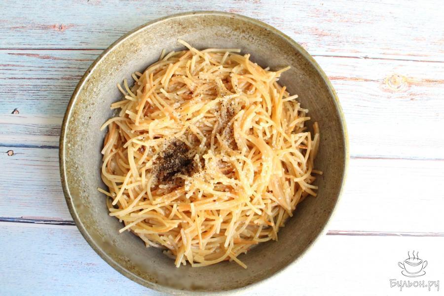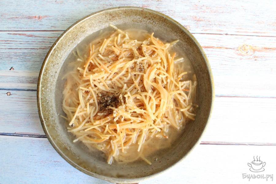 5. Добавим еще стакан воды и снова готовим вермишель до полного выпаривания воды, не забывая перемешивать.