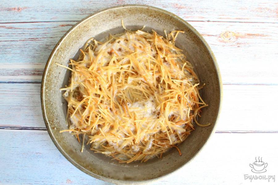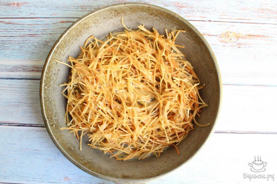 2. В масло выложим вермишель-паутинку и обжарим ее несколько минут до золотистого цвета, постоянно помешивая. Эта вермишель очень быстро обжаривается.