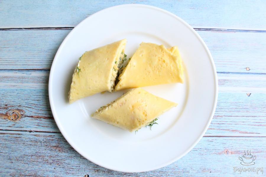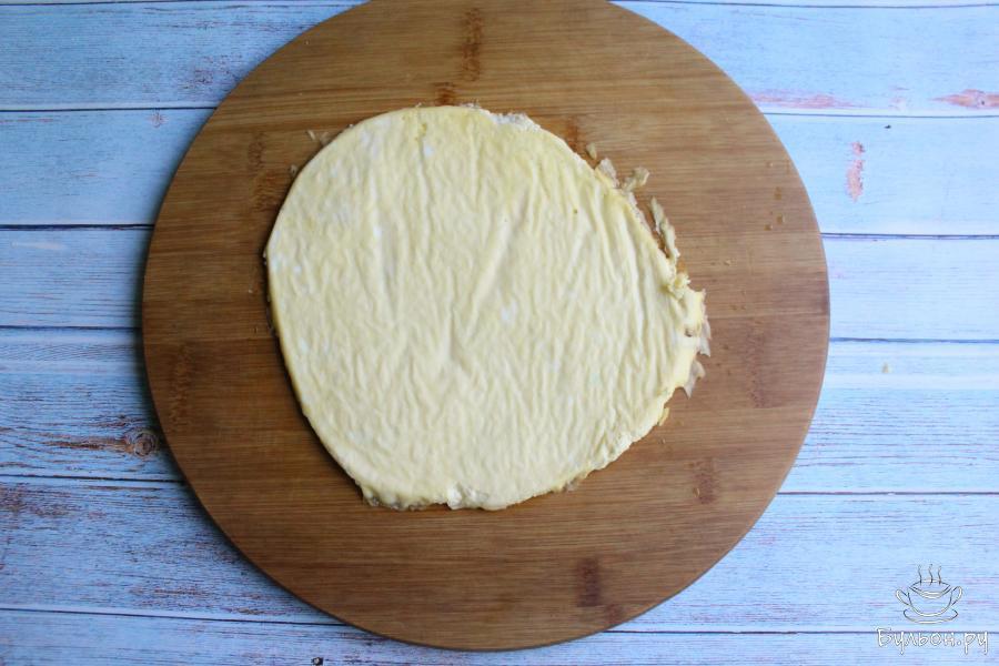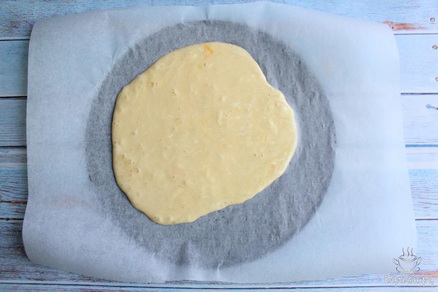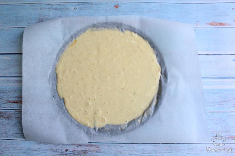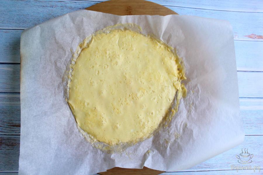 3. Выливаем яичную смесь на противень, застеленный бумагой для выпечки. Я готовлю омлет на донышке от съемной формы для выпечки.