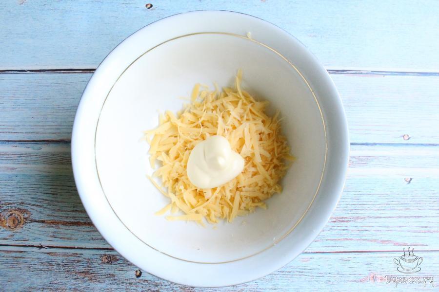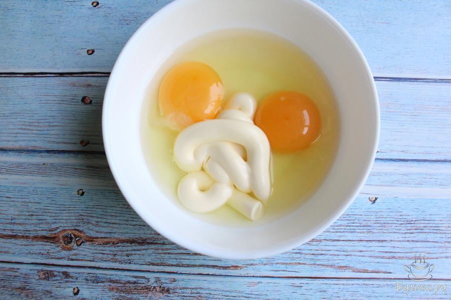 1. Яйца смешиваем с большей частью майонеза. Грамм 20 оставляем для начинки. Майонез можно заменить сметаной.