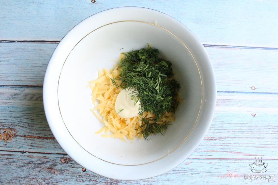6. Укроп промываем, обсушиваем и мелко нарезаем. Добавляем укроп в начинку. Перемешиваем. Зелень для приготовления можно брать любую, которую вы любите.