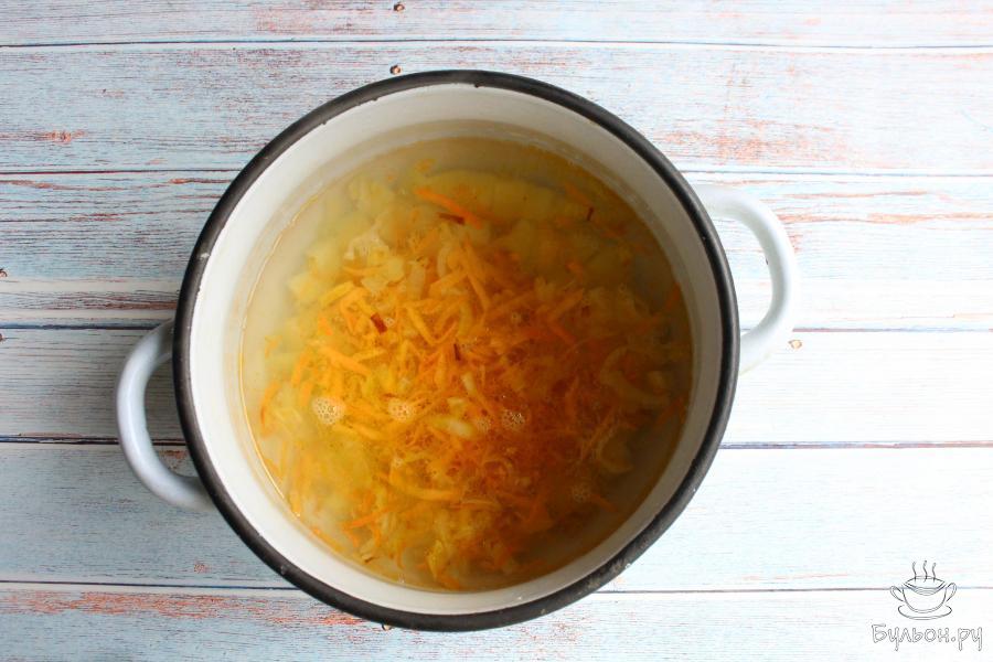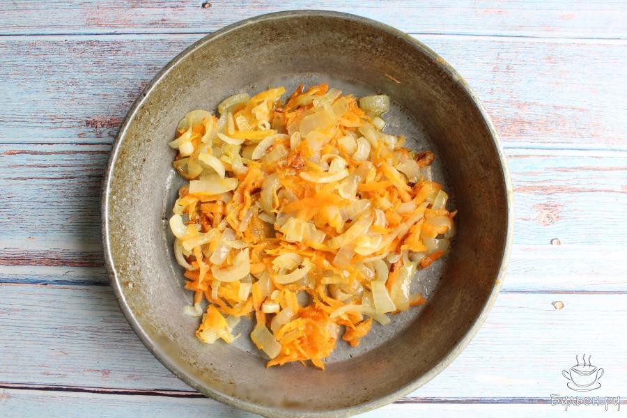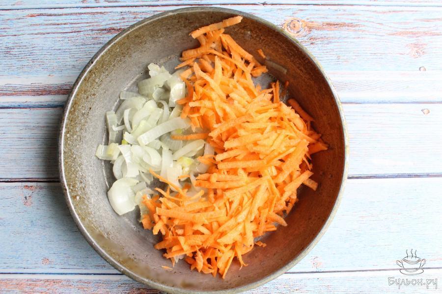 3. Морковь почистим, промоем, перетрем ее через крупную терку и добавим к луку. Тушим овощи до мягкости несколько минут.