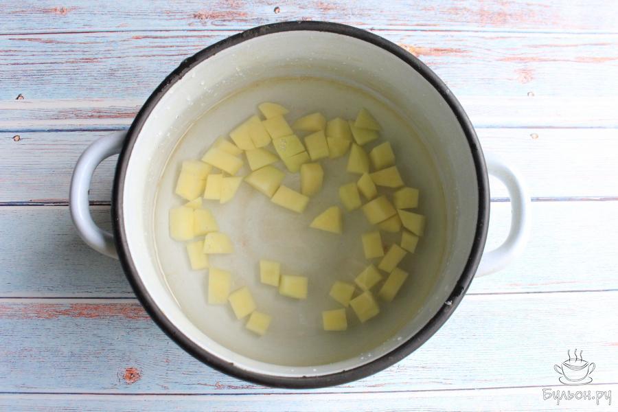 1. Картофель почистим, промоем, нарежем мелкими кубиками и заливаем его водой. Поставим кастрюльку на огонь.
