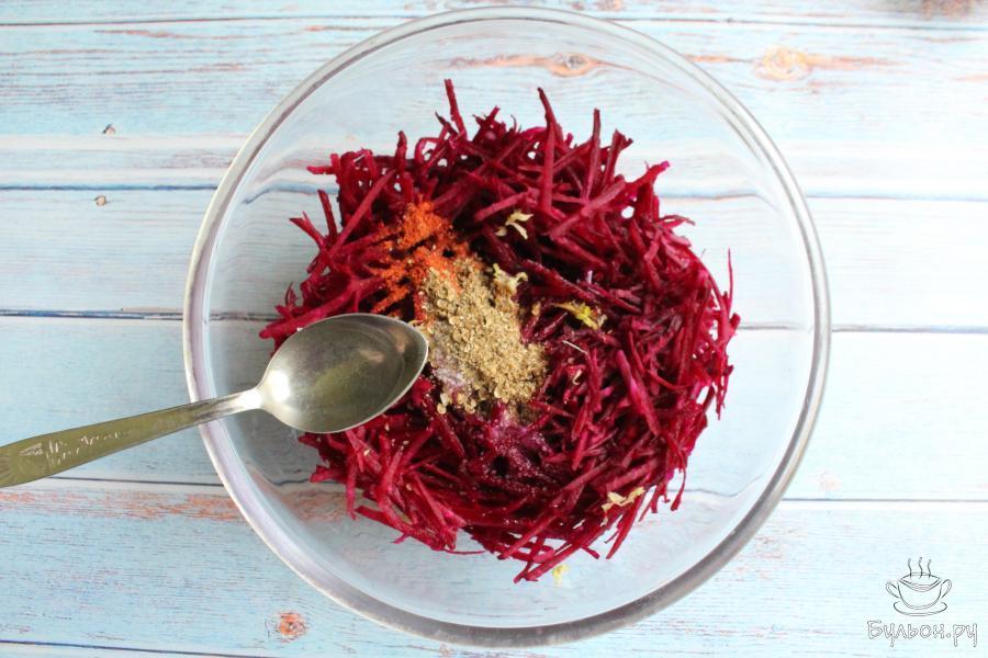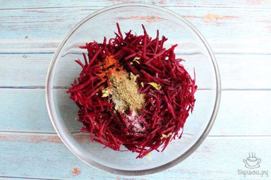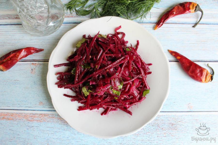 Всем любителям свекольных салатов и закусок, предлагаю приготовить острый корейский салат из свеклы. Салат порадует вас своим пикантным вкусом и яркостью. Готовится такой салат просто и быстро. Салат получается сочный, насыщенный, хрустящий, ароматный, легкий и вкусный. Такой салат можно сразу подать к столу, а можно поставить овощи, на пару часов, под гнет и тогда салат будет более мягкий и нежный. Салат подходит для постного и вегетарианского меню.