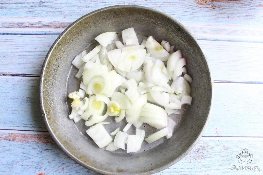 1. Лук почистим, промоем, мелко нарежем и обжарим его на масле до мягкости. Обжарим лук несколько минут, помешивая.