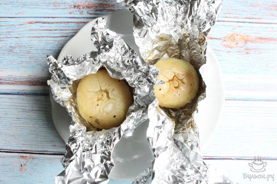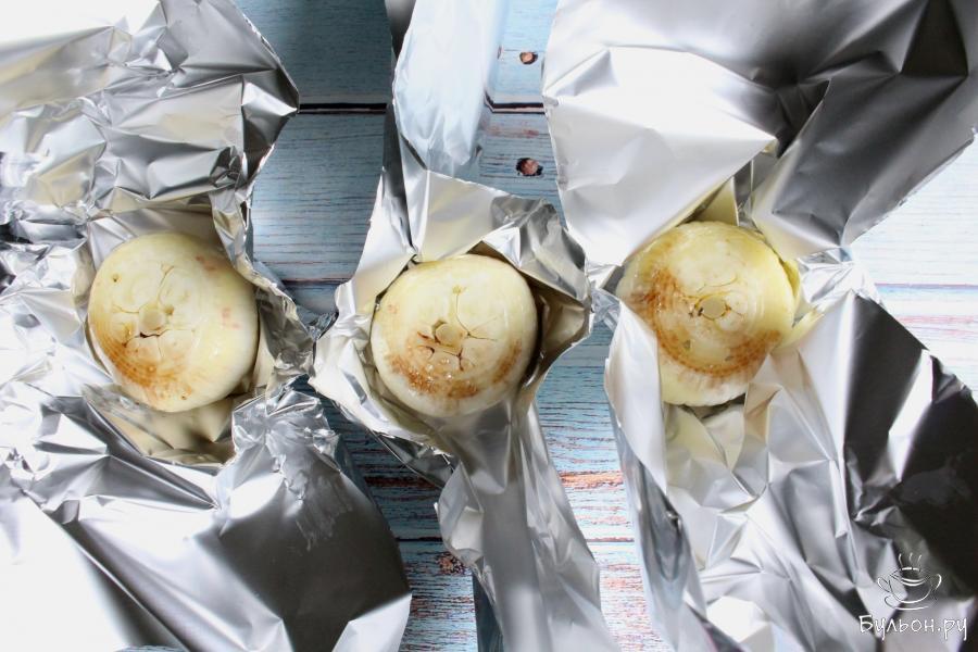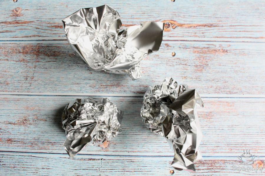 6. Разложим чеснок на разные куски фольги так, чтобы, каждая головка чеснока была завернута по-отдельности.