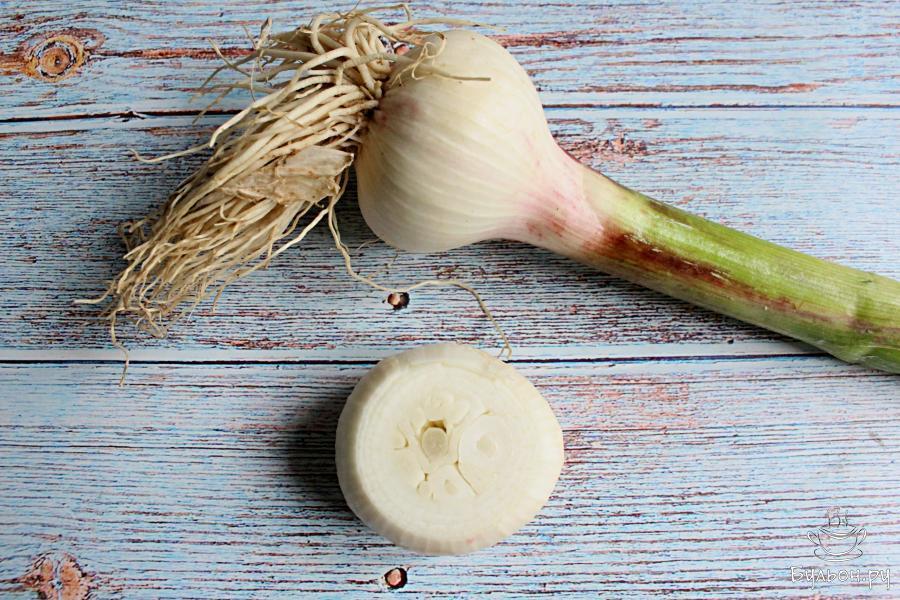 1. Молодой чеснок промоем, срежем у него корешки и стебель. Стебли срезаем так, чтобы были видны зубчики.