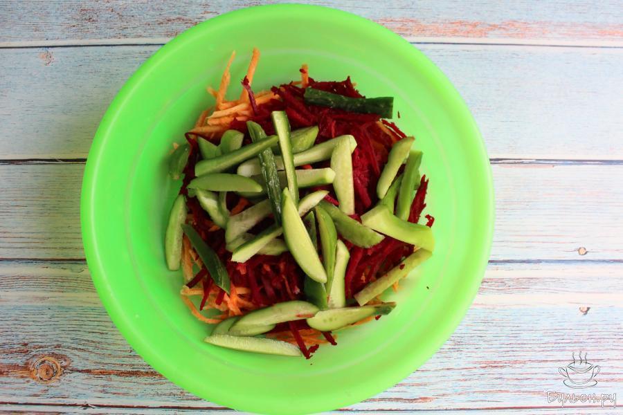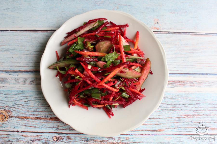 Свекольный салат с огурцами и морковью, можно приготовить острый, или, сделать его по рецепту, совершенно без перца, оба варианта будут вкусные. Салат готовится быстро и просто. Салат порадует вас своей легкостью, сочностью и ярким цветом. Этот полезный, витаминный и хрустящий салат разнообразит постное и вегетарианское меню. Такой овощной салат получается насыщенный, ароматный, аппетитный и очень красивый.