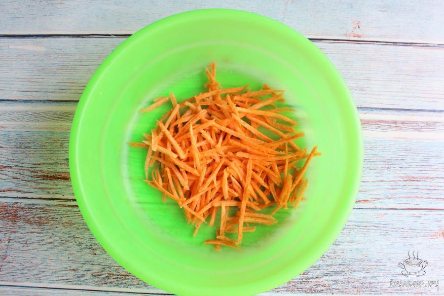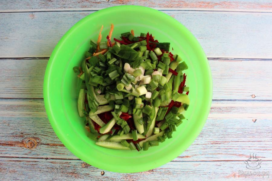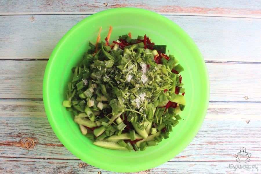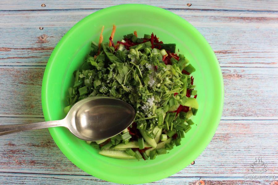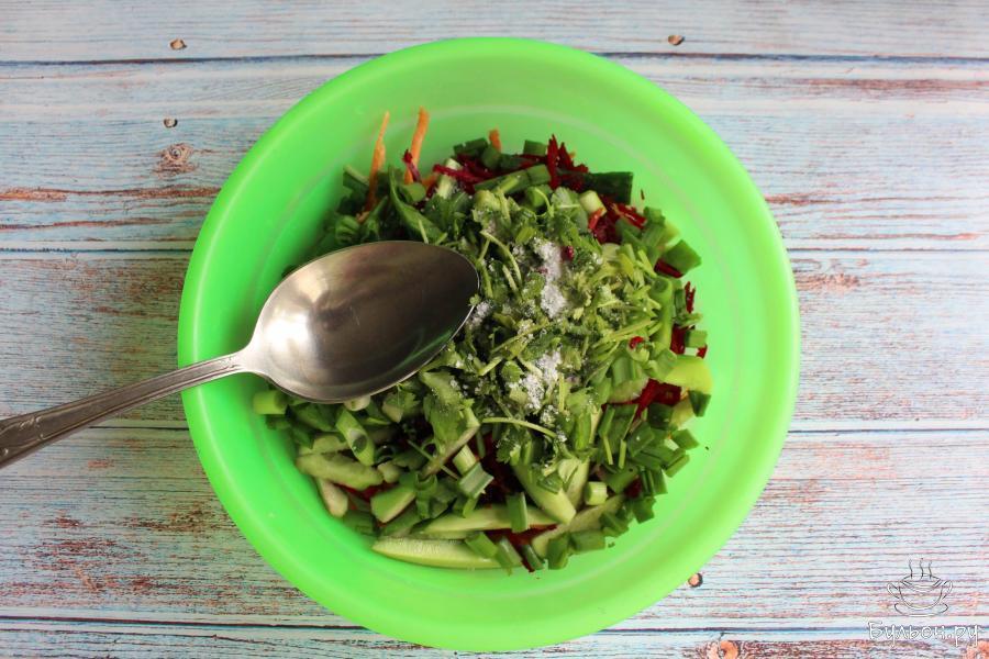6. Добавить в салат соль. Если решили делать острый салат, то добавить перец и можно измельчить в салат пару зубчиков чеснока.