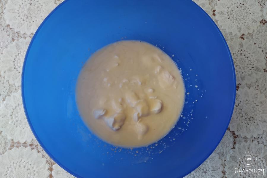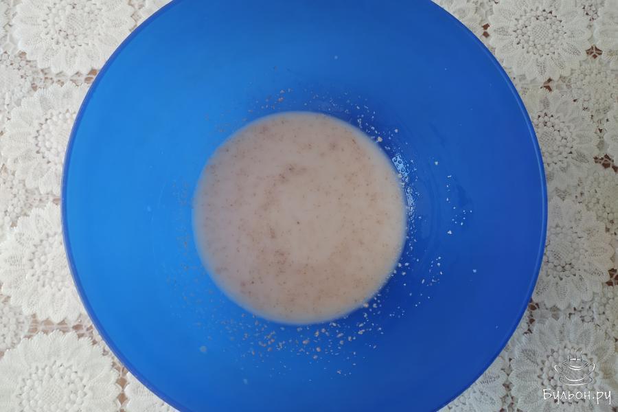 1. В миску налить теплое молоко. Насыпать сухие дрожжи, 1 ст. л. сахарного песка и ванилин. Размешать.
