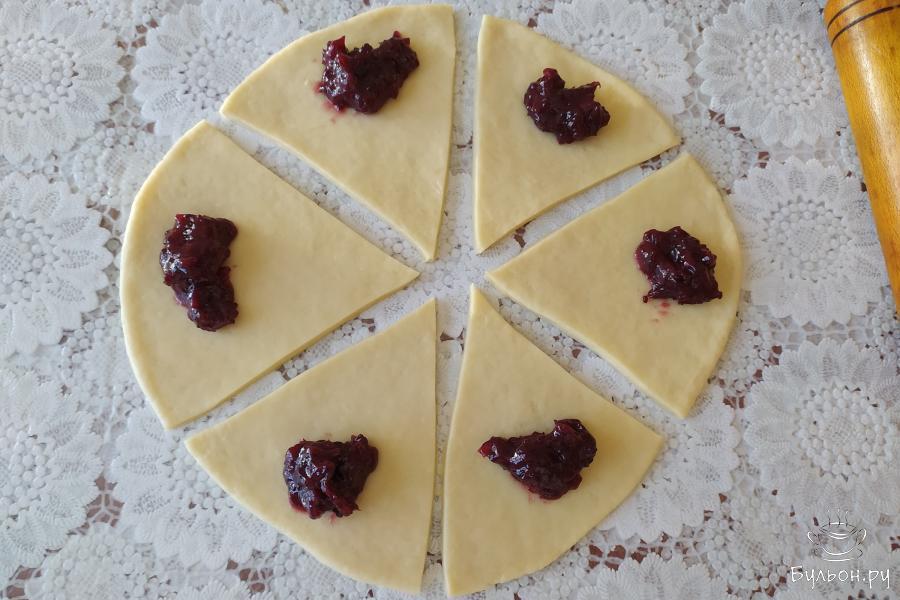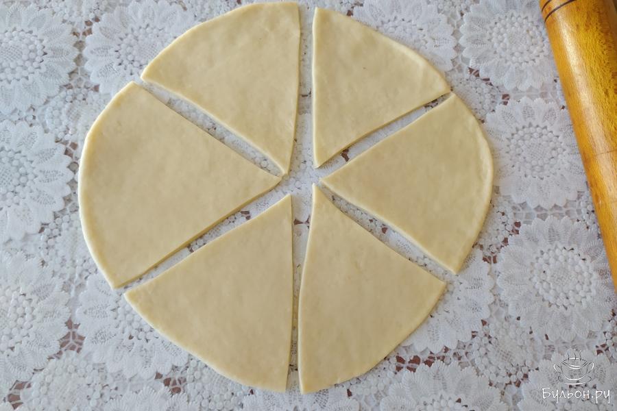 4. Подошедшее тесто обмять и разделить на три равные части. Раскатать каждую часть в круг толщиной 2-3 мм. Нарезать на 6 частей.