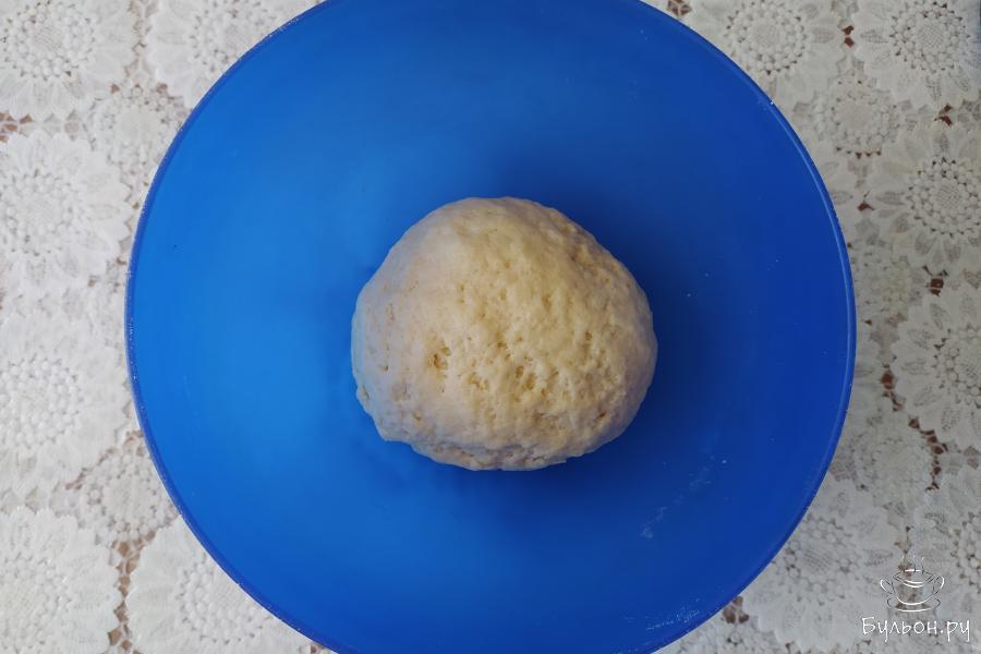 3. Постепенно ввести пшеничную муку. Замесить мягкое, не липнущее к рукам тесто. Оставить его на 20 минут в тепле, накрыв полотенцем.