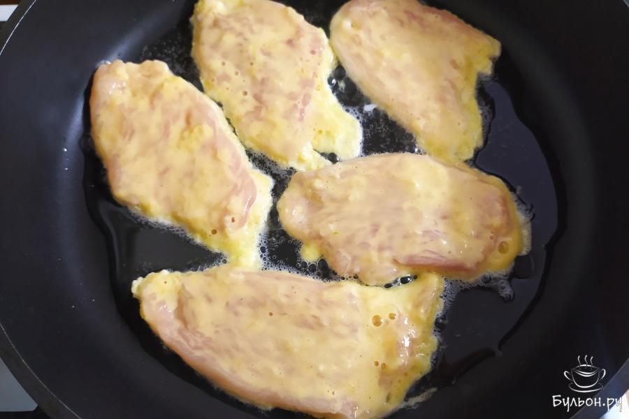 6. Выложить их в разогретую, с растительным маслом, сковороду. Жарить отбивные с двух сторон под крышкой. Готовим на умеренном огне по 4-5 минут с каждой стороны.