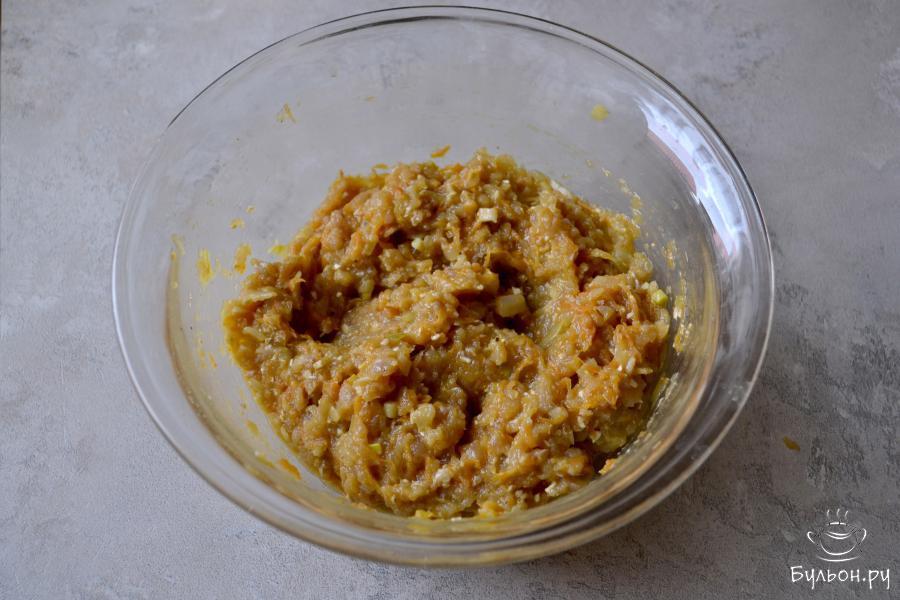 6. Тщательно перемешайте фарш с обжаренными овощами и всыпьте измельченные овсяные хлопья и крахмал.