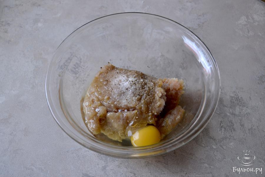 4. Положите в глубокую миску рыбный фарш, вбейте яйцо, посолите и посыпьте черным молотым перцем. Перемешайте.