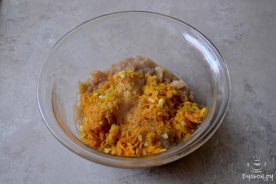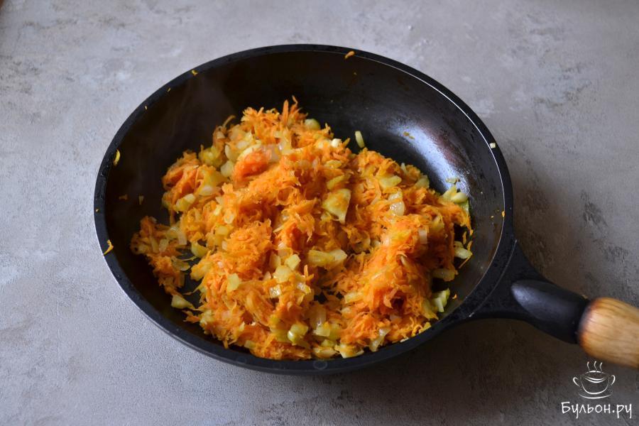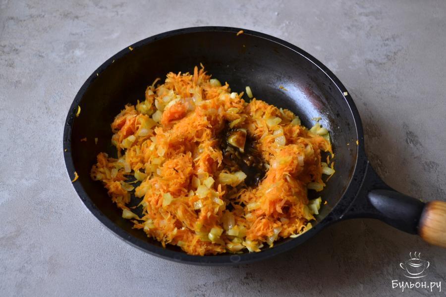 1. Очистите морковь и лук. Лук нарежьте, морковь натрите на крупной терке. Разогрейте сковороду с растительным маслом и отправьте в нее овощи.