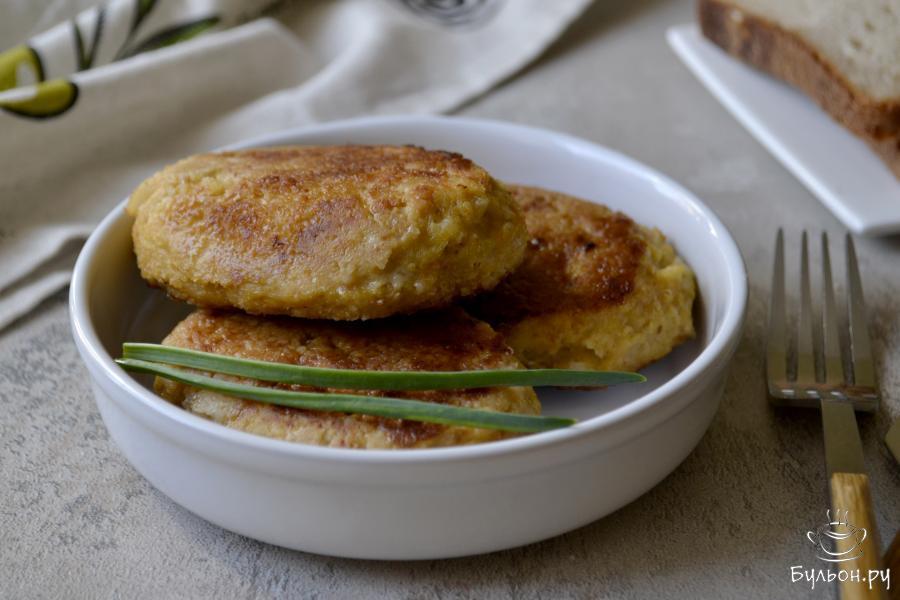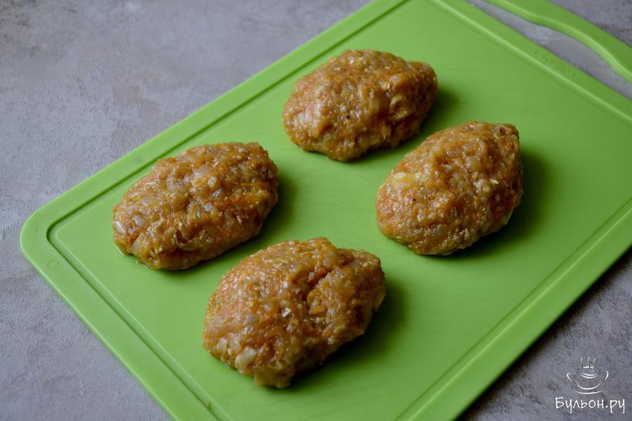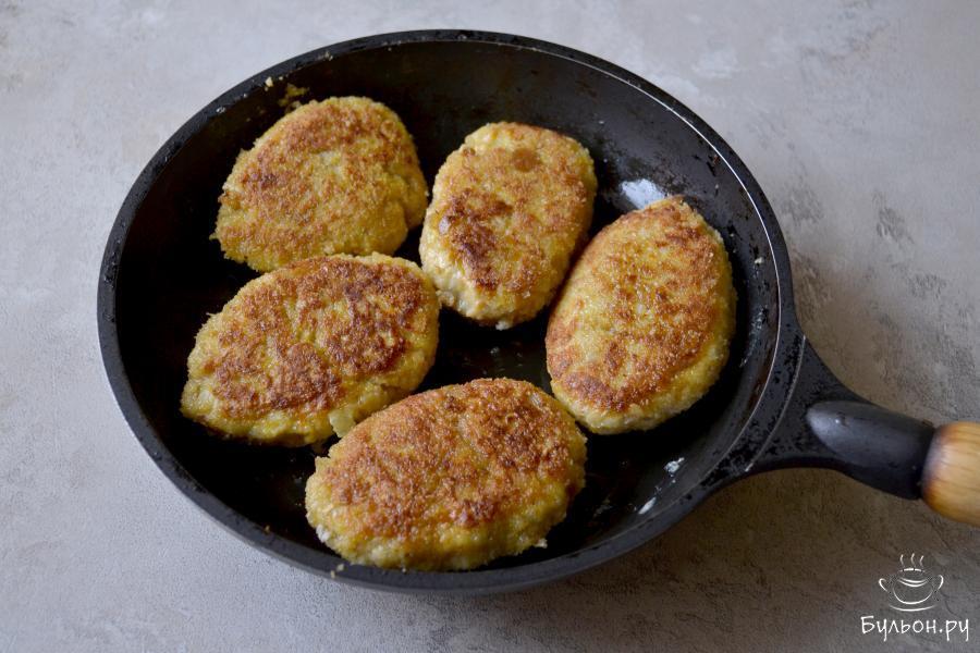 10. Положите котлеты на хорошо разогретую с растительным маслом сковороду. Обжаривайте котлеты на огне, ниже среднего, под крышкой, до румяной корочки 10-15 минут.