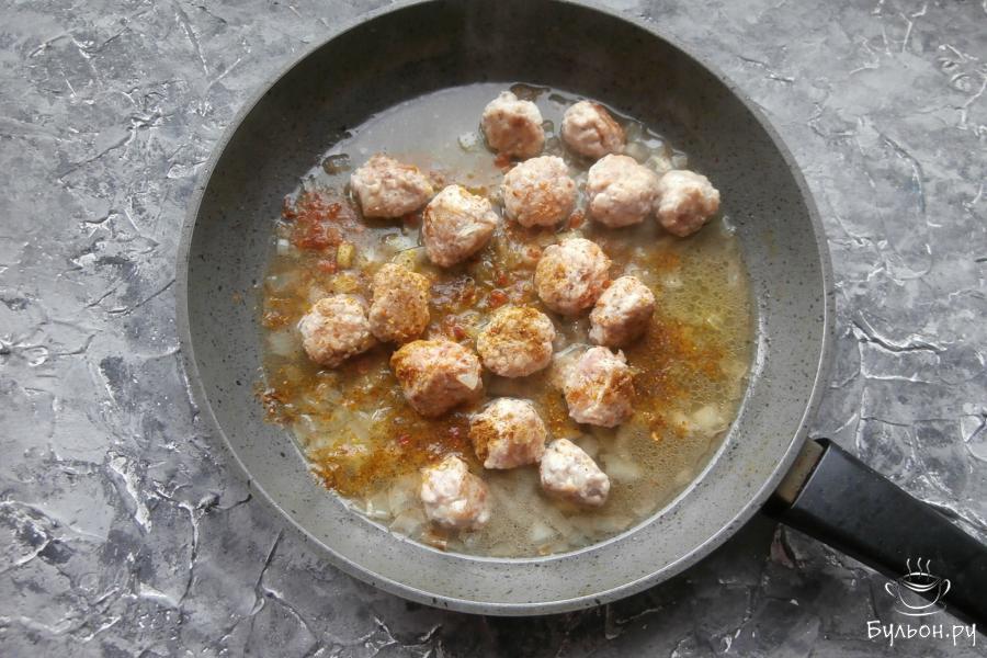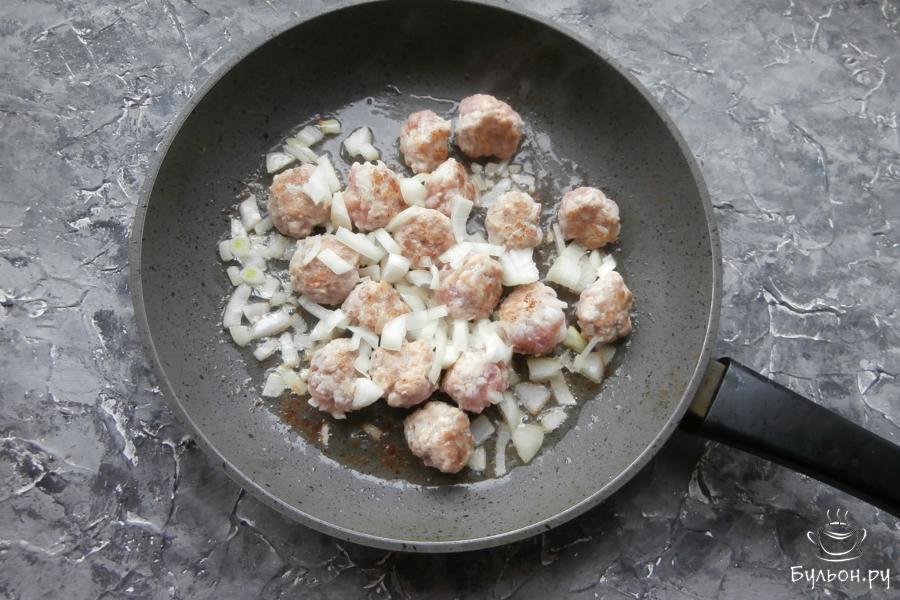 3. Сковороду разогреть, влить растительное масло. Из смешанного фарша сформировать маленькие фрикадельки и выложить их в сковороду. Фрикадельки немного обжарить, переворачивая, затем, добавить оставшуюся половину лука.