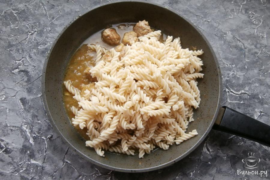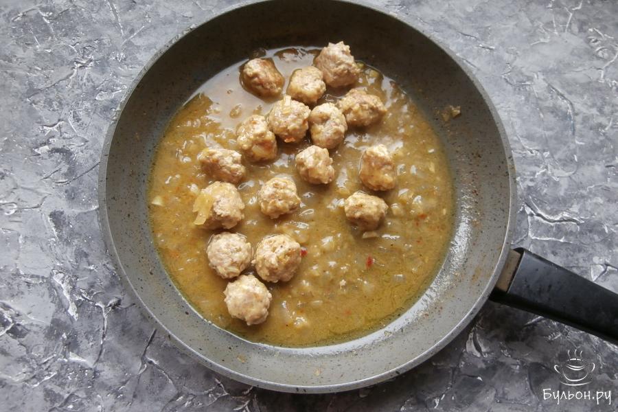 4. Немного все вместе обжарить, влить подсоленный бульон, всыпать приправу. Все аккуратно перемешать и протушить фрикадельки в бульоне минут 10-15 под прикрытой крышкой и на минимальном огне.