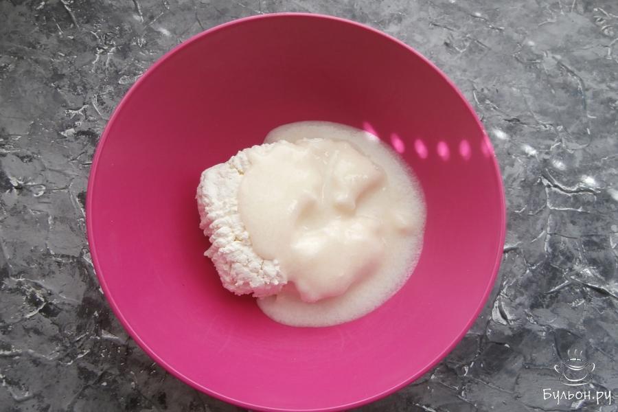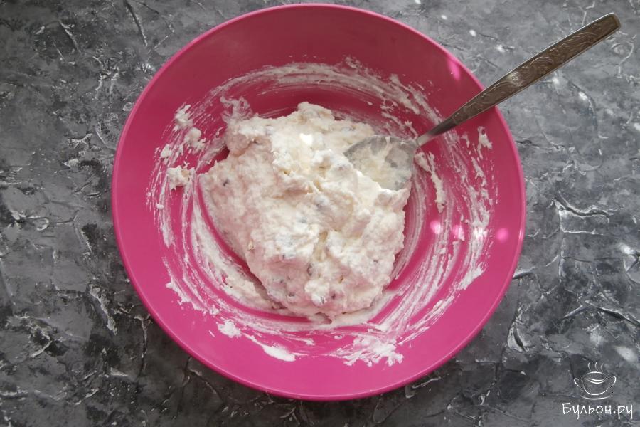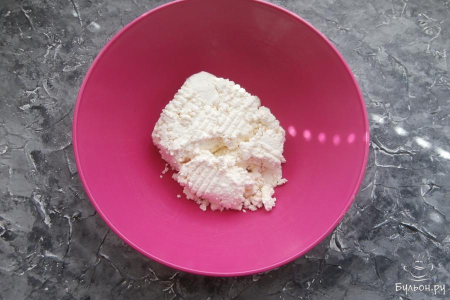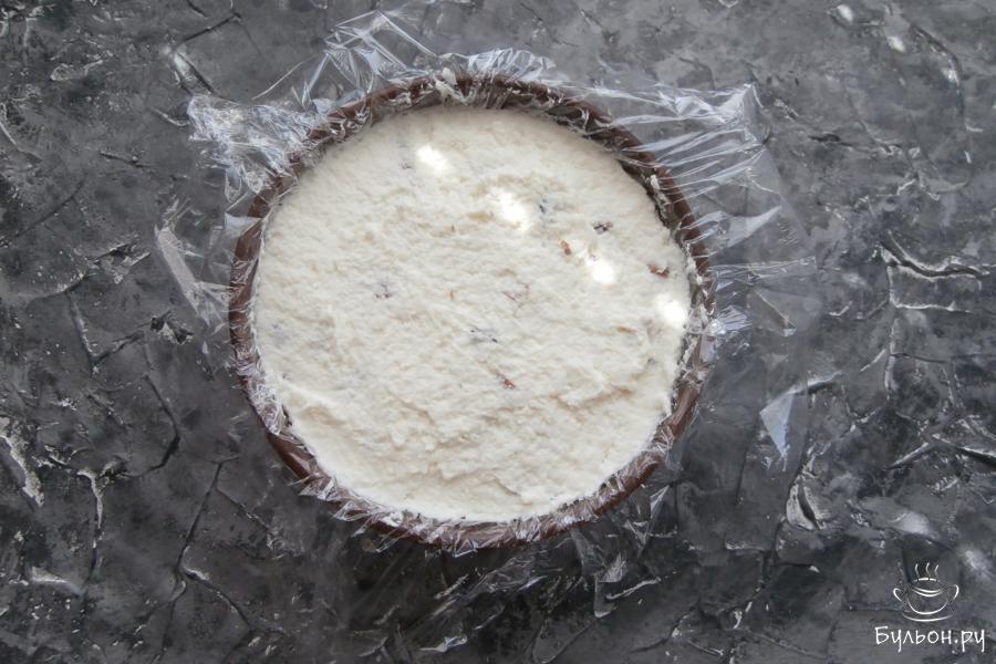 9. Подходящую формочку (салатник, миску и т. д.) застелить пищевой пленкой и выложить в нее творожную массу, хорошо уплотняя. Отправить формочку в холодильник часа на 4.