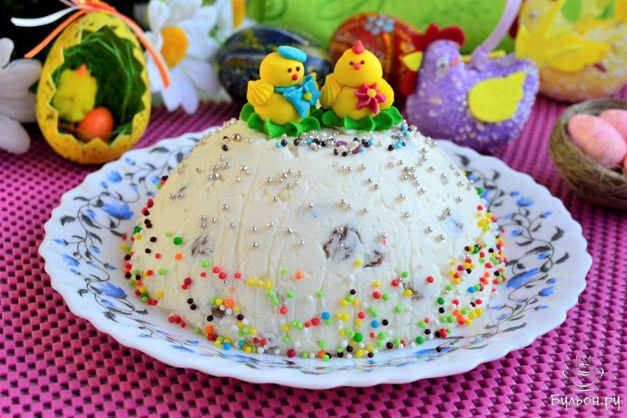 10. Теперь творожную пасху перевернуть на тарелку, убрать пленку и украсить ее кондитерской посыпкой. Приятного аппетита.