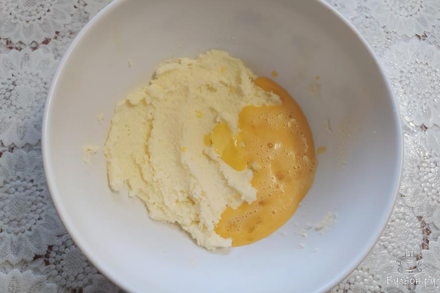 2. Мягкое масло растереть ложкой с сахаром (40 г) и ванилином. Добавить половину разболтанного яйца, перемешать.