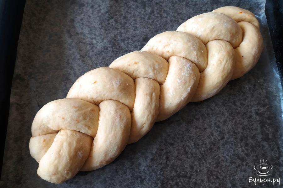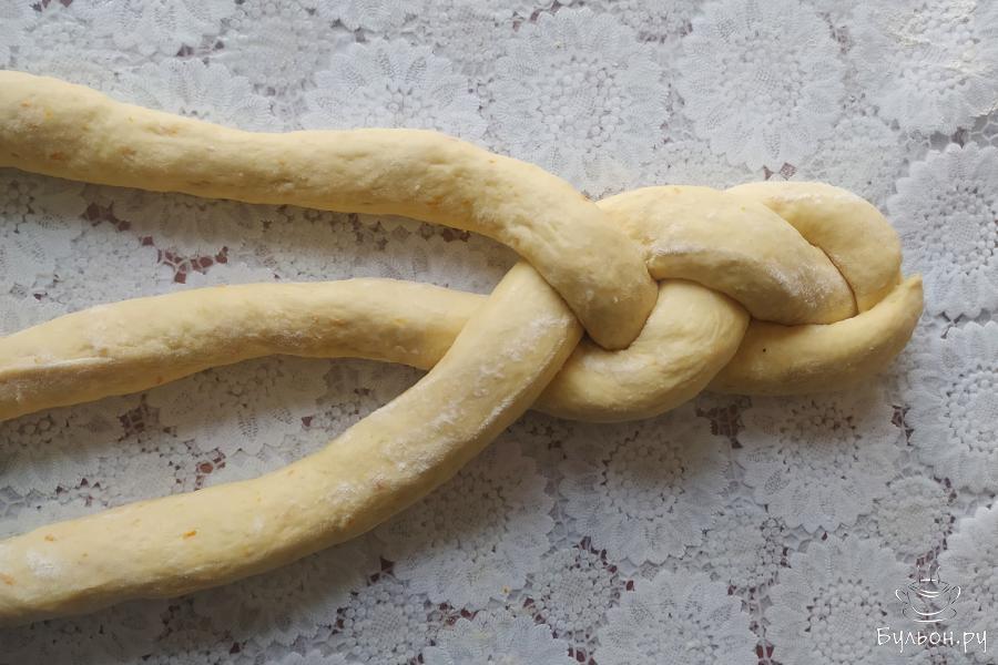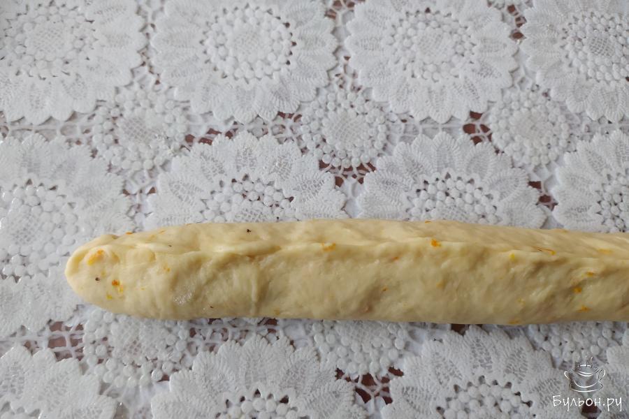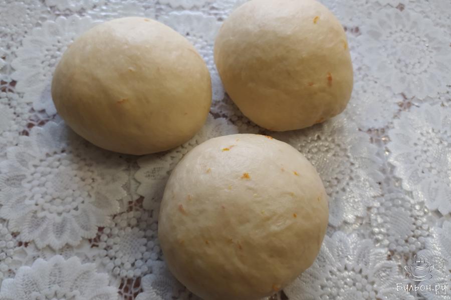 4. Частями ввести 250 г муки с цедрой апельсина. Замесить мягкое тесто. Накрыть его полотенцем и оставить в тепле на один час.