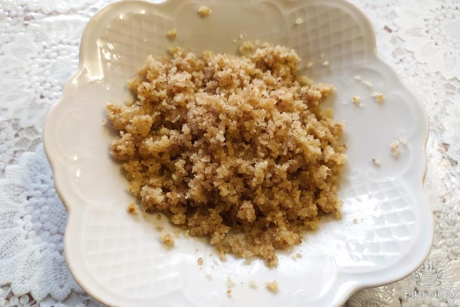 6. Для ореховой начинки, в чашу блендера поместить орехи, 1 ст. л. сахарного песка и 1-2 ст. л. растительного масла без запаха. Измельчить.