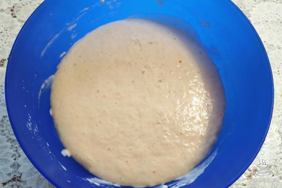 1. Приготовление теста начать с опары. В миске соединить теплое молоко, 1 ст. л. сахара, дрожжи и 100 г муки. Размешать. Оставить опару на 15 минут в тепле, прикрыв полотенцем.