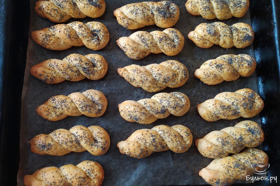 8. Выкладываем печенье на противень, застеленный пекарской бумагой. Смазываем яйцом и посыпаем сахаром и маком.