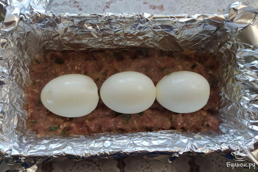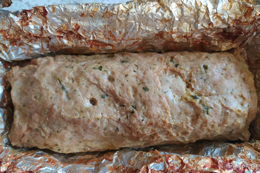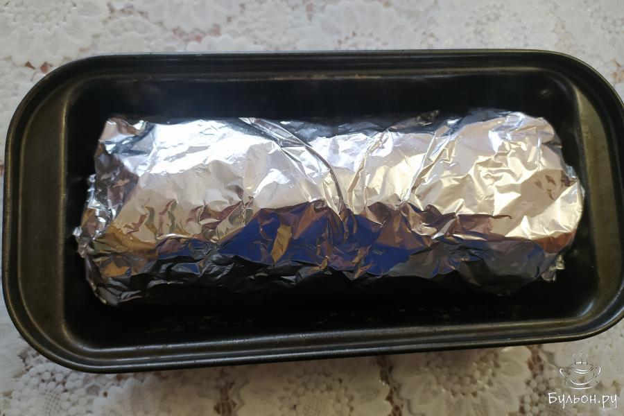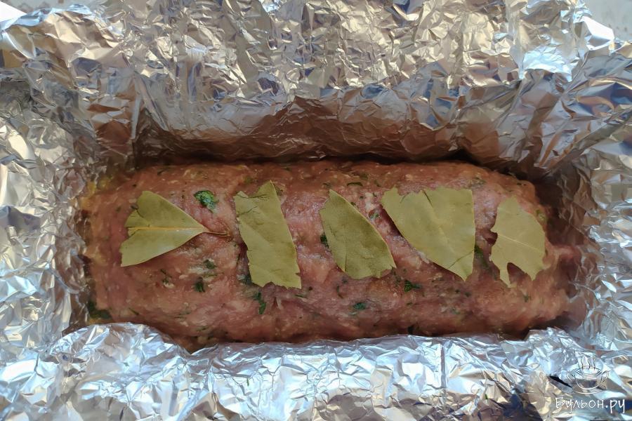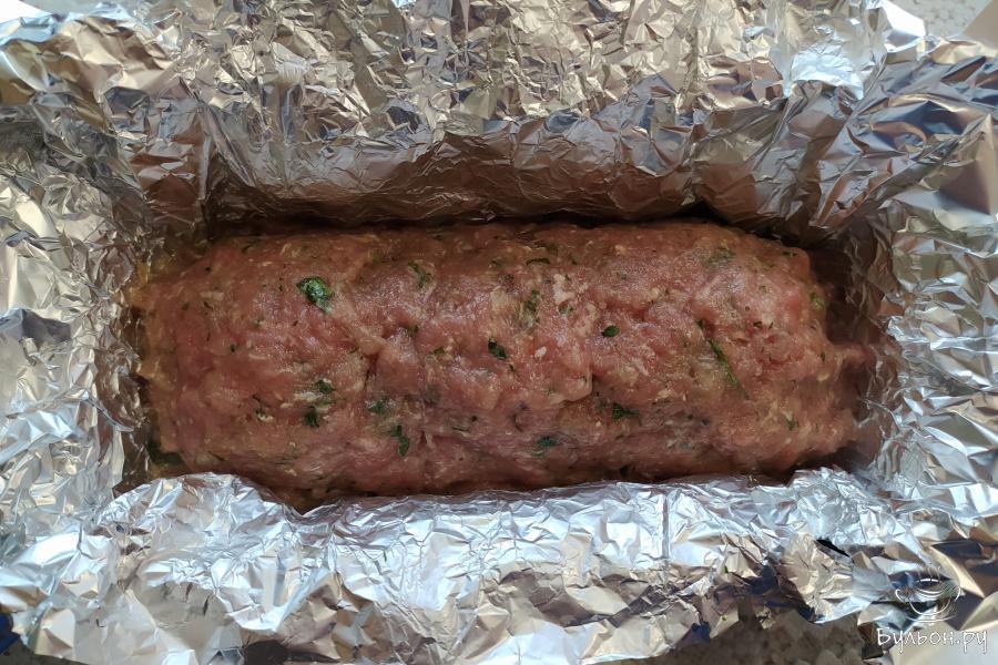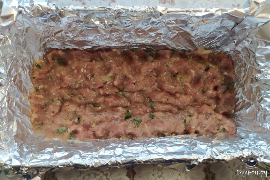3. Небольшую прямоугольную форму застелить фольгой в два слоя, смазать маслом. Фольги брать с запасом, чтобы можно было накрыть митлоф. Выложить половину фарша в форму.