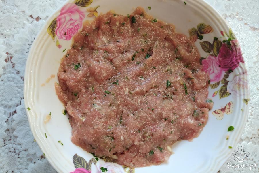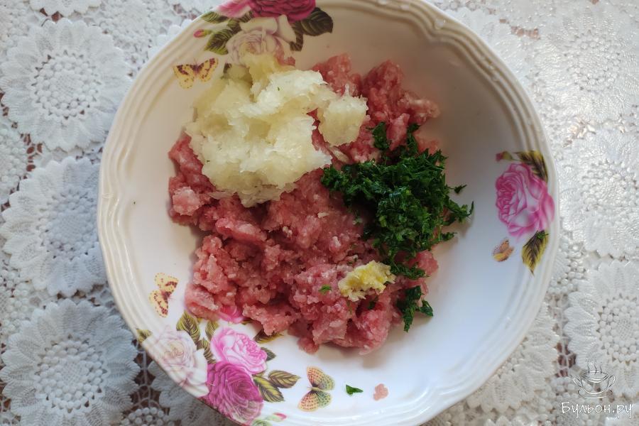 1. Репчатый лук и зубчики чеснока почистить. Лук измельчить на крупной терке, чеснок на мелкой. Укроп и петрушку мелко нарезать. Добавить все к мясному фаршу.