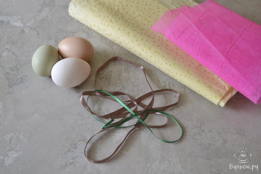 Приближается Светлый праздник Пасхи. Крашеные яйца - это один из символов этого праздника. Но если вы по каким-либо причинам не хотите красить яйца, то можно обойтись без этого. А украсить пасхальные яйца, можно, используя цветную гофрированную бумагу, пергамент, бумажные салфетки или, как в нашем рецепте, подарочную упаковку, в которую обычно упаковывают букеты цветов в магазине. Если у вас есть детки - привлеките их к украшению яиц. Детям такие занятия точно понравятся.