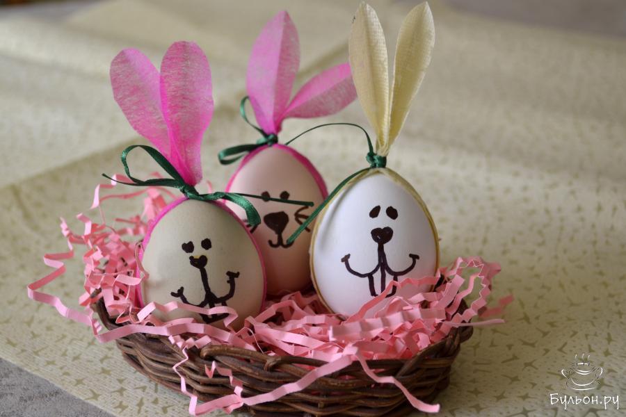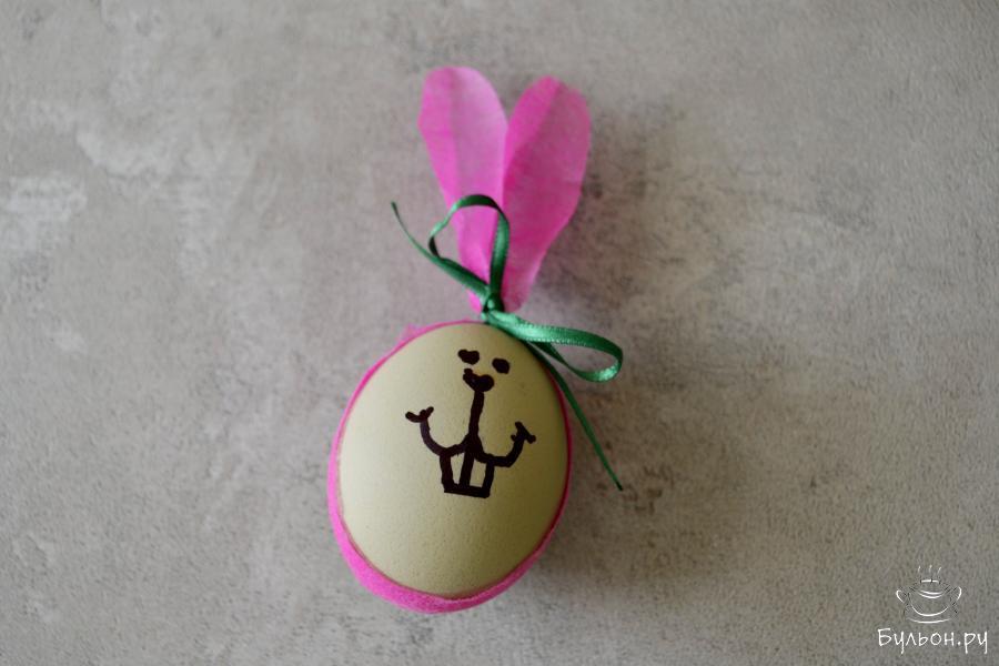 4. Маркером нарисуйте на яйцах мордочки зайчиков. Оберните полоску вокруг яйца, сверху завяжите ее ленточкой или веревкой. Ленточку можно завязать на бантик. Расправьте ушки - пасхальный зайчик готов.