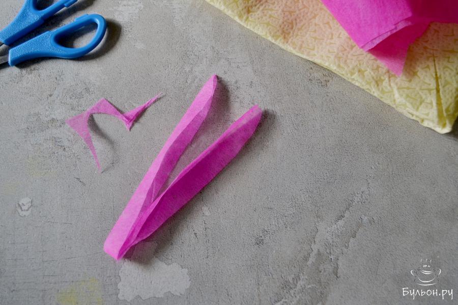 3. Сложите полоску вдоль пополам, получится сторона полоски 1 см. Перегните полоски поперек пополам и ножницами сделайте закругления ушек.