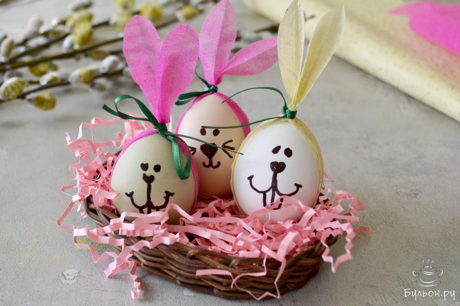 1. Первым делом вымойте и сварите куриные яйца вкрутую. Затем охладите их и вытрите насухо. Для украшений потребуется цветная бумага, маркер, ножницы, тонкие ленточки или веревка.