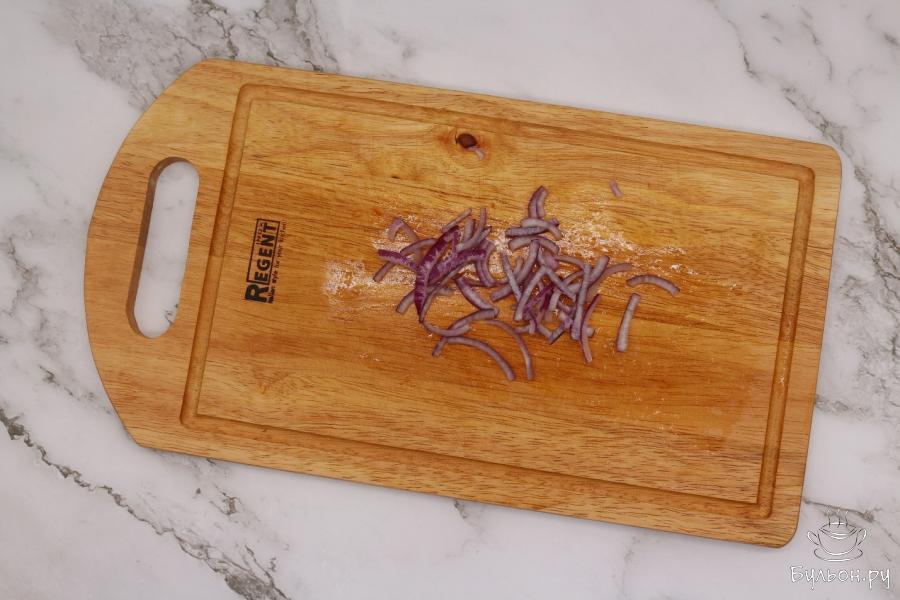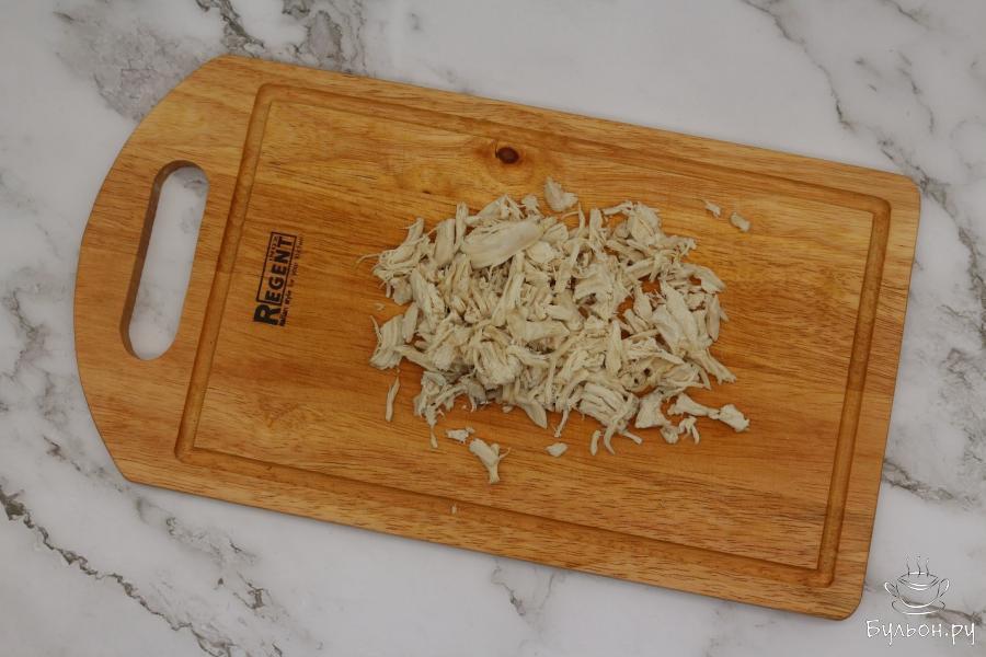1. Отварим, в подсоленной воде, кусочек куриного филе в течение пары часов, так, чтобы мясо стало мягким, разваливающимся. Дадим ему остыть, после чего разберем его на кусочки.