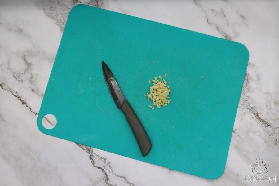4. Чеснок мелко нарезаем с помощью острого ножа. Ни в коем случае не давим его через пресс, так как вытечет сок, а нам это не нужно.